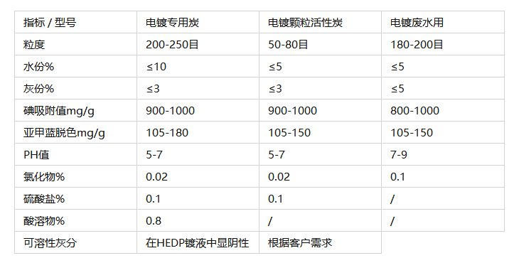注:電鍍專用炭:可溶性灰分在HEDP鍍液中顯陰性,避免在處理電鍍?nèi)芤簳r產(chǎn)生雜質(zhì)而影響電鍍效果